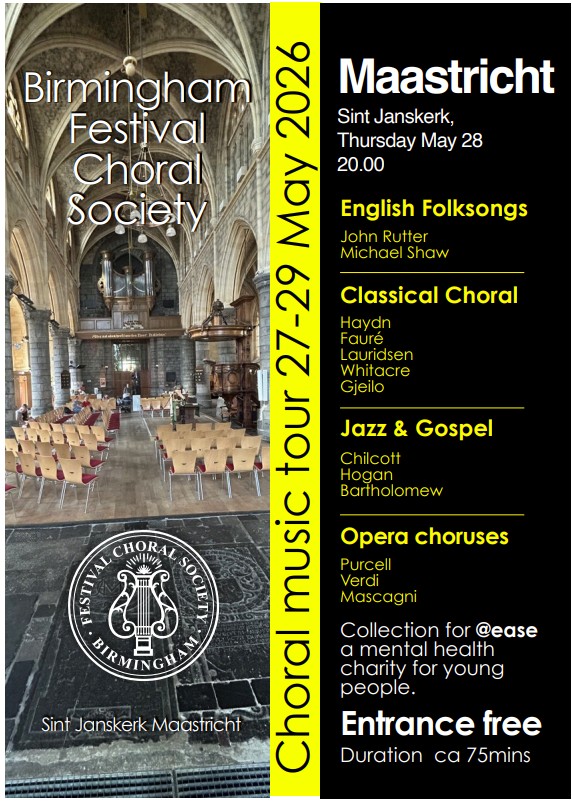Join us for an unforgettable evening of choral music and community spirit! The Birmingham Festival Choral Society (BFCS) is touring Europe from 27–30 May 2026, performing in Liège, Maastricht, and Namur. On 28 May, the BFCS will perform at Sint Janskerk in Maastricht at 20:00. This is a free concert, but at the end of the performance, we invite you to make a donation to a meaningful cause: @Ease, the University of Maastricht’s foundation supporting young people aged 12–25 who face challenges when “life doesn’t quite go as planned.” Experience world-class music while making a real impact in your community.