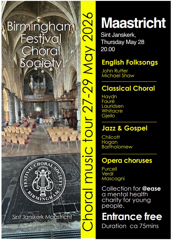 Kom en geniet van een onvergetelijke avond vol koormuziek en gemeenschapszin! De Birmingham Festival Choral Society (BFCS) maakt van 27–30 mei 2026 een tournee door Europa, met optredens in Luik, Maastricht en Namur. Op 28 mei treedt de BFCS op in de Sint Janskerk in Maastricht om 20:00 uur. Dit is een gratis concert, maar aan het einde van de uitvoering nodigen wij u uit een donatie te doen voor een waardevol doel: @Ease, de stichting van de Universiteit Maastricht die jongeren van 12–25 jaar ondersteunt die te maken hebben met uitdagingen wanneer “het leven niet helemaal loopt zoals gepland.” Beleef muziek van wereldklasse terwijl u een écht verschil maakt in uw gemeenschap.